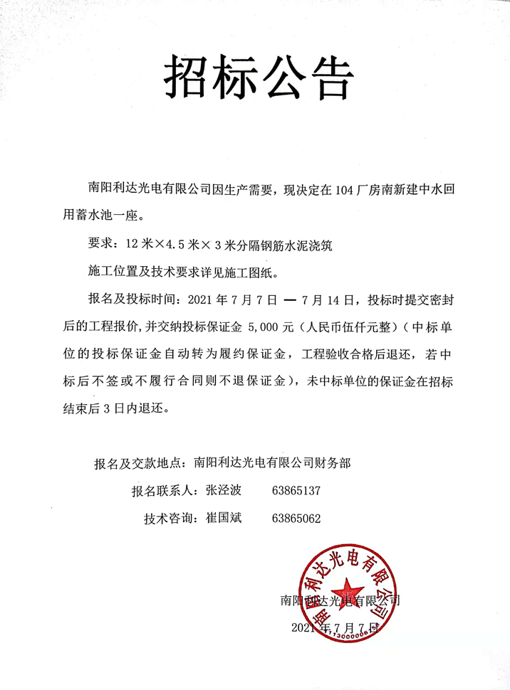 修建104廠房中水回用蓄水池招標(biāo)